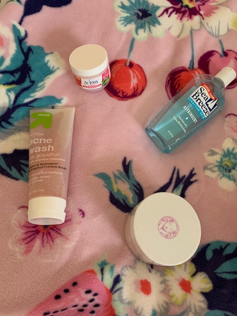 The first thing I go in with is a face scrub called Up & Up from Target, an off brand of the Neutrogena Pink Grape Fruit. I get this because it is cheaper than the Neutrogena and has about the same results. The second thing I do is use the sea breeze astringent. This helps with some of my blemishes and usually gets rid of them. I also get the sensitive skin one since my skin sometimes reacts to harsh products. If yours does that too, I suggest you pick this product in sensitive skin. The third thing I like to use the St.Ives oil-free face moisturizer. I like how it does not cause breakouts for me. What I do not like about it is that the scent is called watermelon even thought it doesn’t smell like watermelons. I just thought that was a bit weird. The last thing I finish up with is the Dermalactives salt scrub. I like to use this on my hands after I shower. It makes them feel smooth, and it helps when my hands are cracked whether it is caused by washing my hands a lot or just from the weather which I love.
