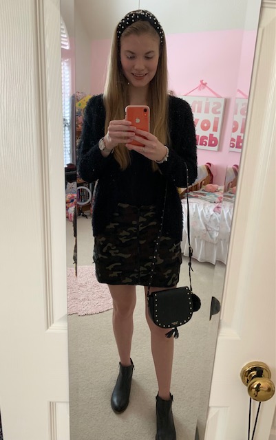 To start off, I am really into different prints for the fall and one my favorites is camo. I got this skirt at Rue 21 and it didn’t cost much at all. I feel like their prices are pretty decent and they have some of the perfect pieces for my fall wardrobe. I decided to pair this with my black cardigan sweater and a little tank top underneath, both pieces from JC Penney I got years ago. I think this outfit will be perfect for pumpkin patch pictures and of course maybe for a day of apple picking as well. I like all the spooky feels it gives me when putting this outfit on. I am a huge fan of fall wardrobes. I like how we can layer everything up and I love all the accessories fall has to go with all your outfits. The other thing I like about this outfit is that your not to hot or too cold in it. I think it is good for the kind of weather we have in Texas because it is still like 80 degrees in October which is crazy. That is why I am such a skirt person I feel like they are just easy to slip on and usually go with this Texas weather. I do love skirts and I like that I can get the most out of wearing them because believe me I do.