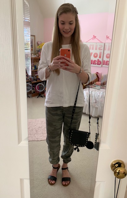 The final outfit I am going to talk about is the one I recently purchased from Khol’s. I did a try on session on my Instagram account if you wanna check that out @sarahlovespink_slp! If it is not in my story it will be saved in my highlights under try on. So I got these camo sweatpants and like I said I am obsessed with camo. I think it is a nice color for fall and ties black in really well. Which I just paired with a plain white long sleeve top. I am not sure where this top is from but a plain white long sleeve top is easy to find anywhere! I am a big bargain shopper. I really think this tied my whole outfit together.