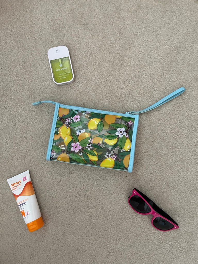 The first item we are going to talk about is this Vera Bradley beach pouch, I bought this back in April at the outlets because there was a good sale on cute pouch. I love the print the pouch has lemons all over it. It really gives me that summer vibe which I love when my stuff goes with the seasons. The pouch fits basically my sunscreen, hand sanitizer, hair ties, sunglasses, and my phone! So it does hold a decent amount of stuff that I would need at the pool or the beach.