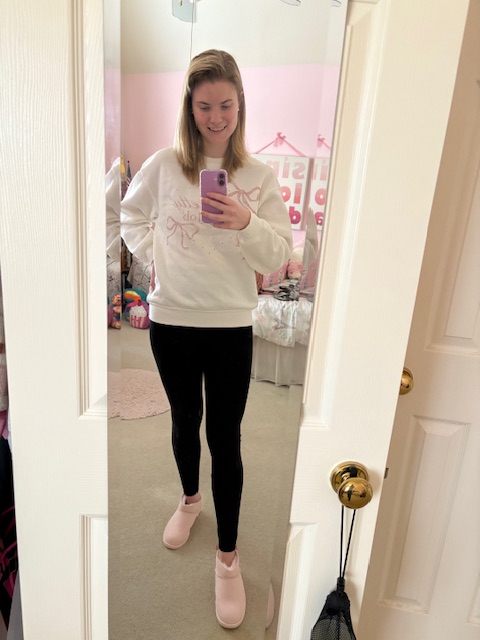 The first item I love wearing is this Walmart sweatshirt! I think it is so funny and cute and I love the saying and I love the jewels that make a heart around the wording! I also love the bows of course, I wouldn’t be a girly if I didn’t. Anyways it is a prefect winter sweatshirt and perfect for south temperatures in the winter!