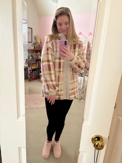 The next thing I been really loving is this jacket from Maurice’s, I think it is so cute and of course it is pink! I love that it looks like checker print I think it gives the jacket some character. It is also super soft as you can see I like to be cozy and comfortable in the winter time.
